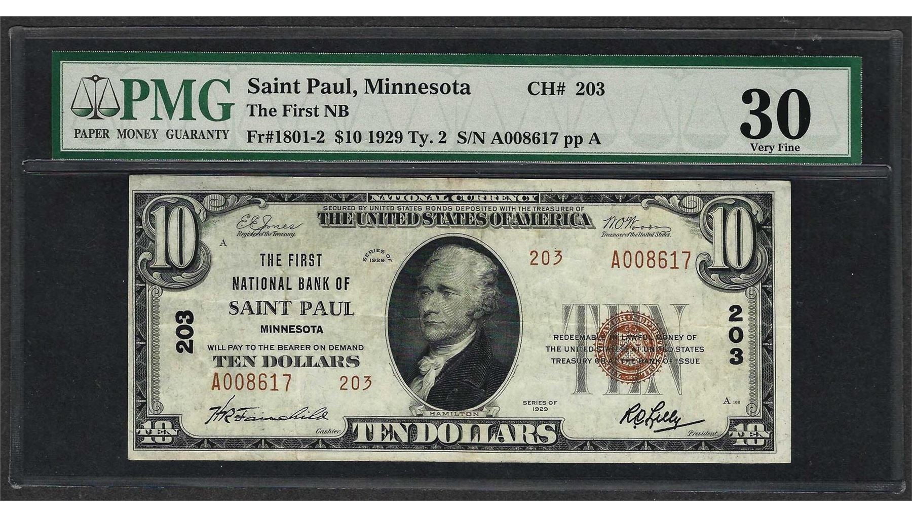 One 1929 $10 National Currency Note Saint Paul, Minnesota CH# 203 PMG Very Fine 30. PMG Certified.