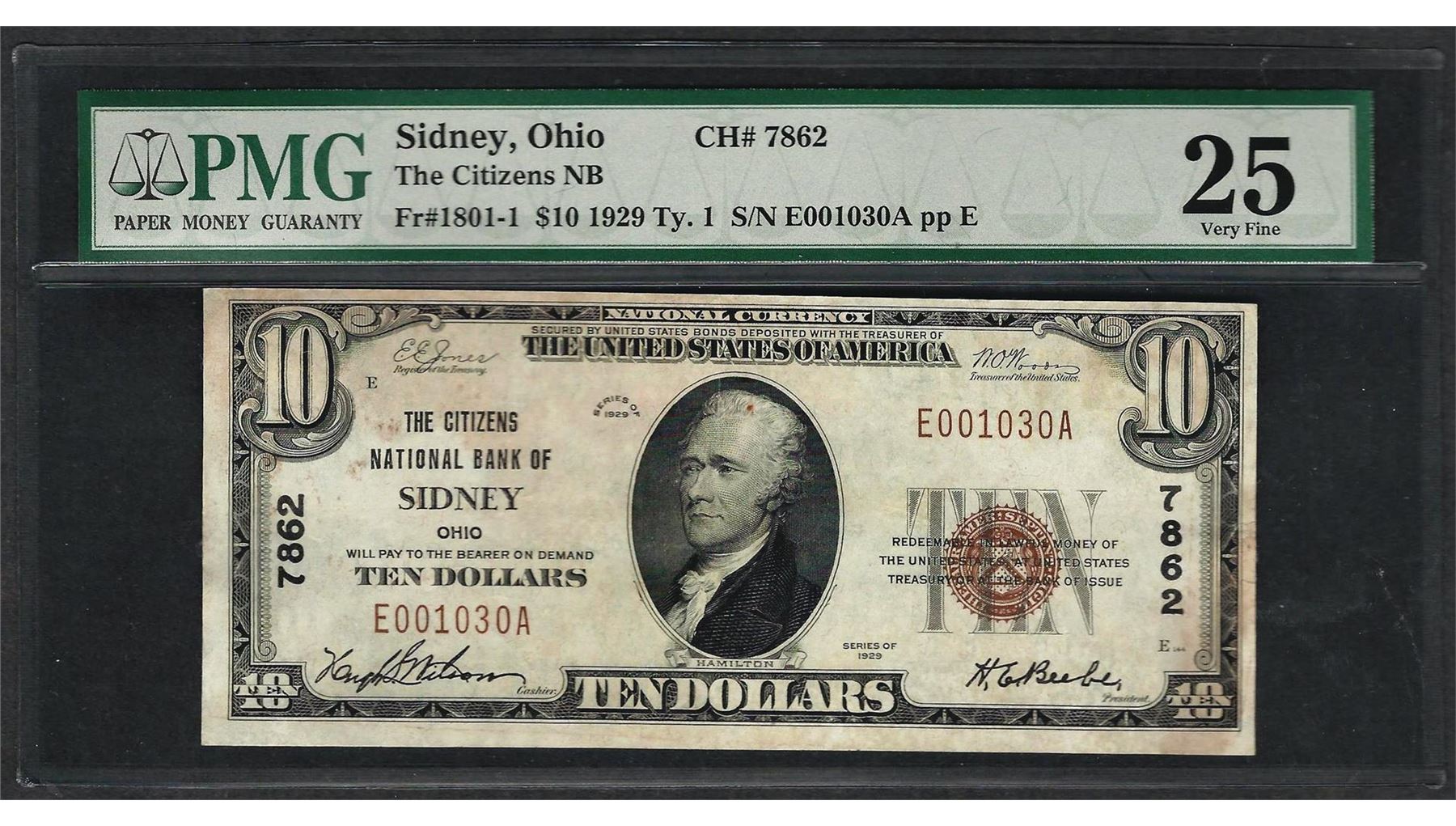 One 1929 $10 National Currency Note Sidney, Ohio CH# 7862 PMG Very Fine 25. PMG Certified.