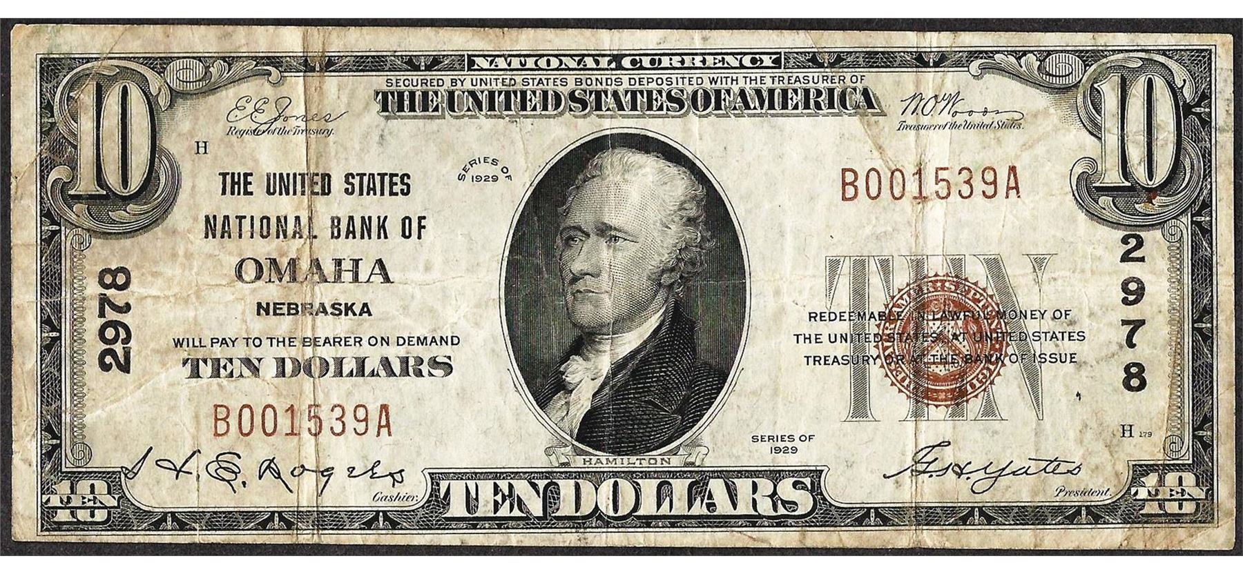 One 1929 $10 National Currency Note United States NB of Omaha, Nebraska CH# 2978.