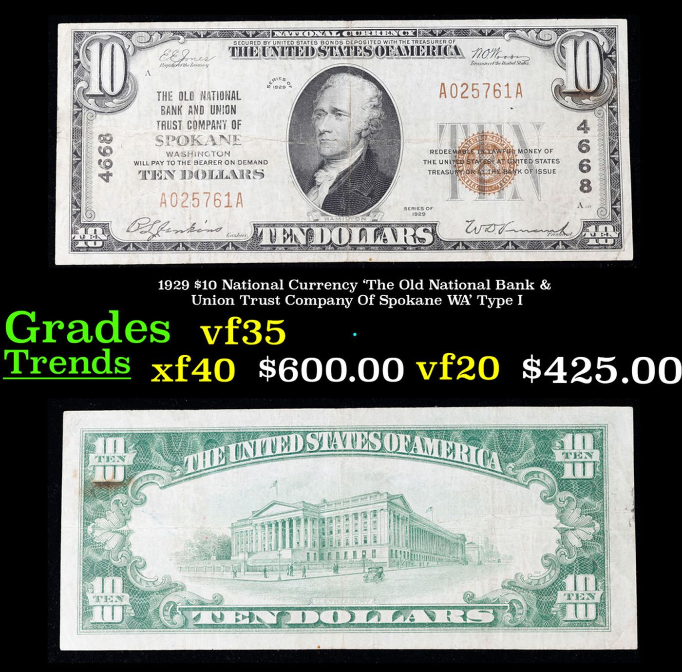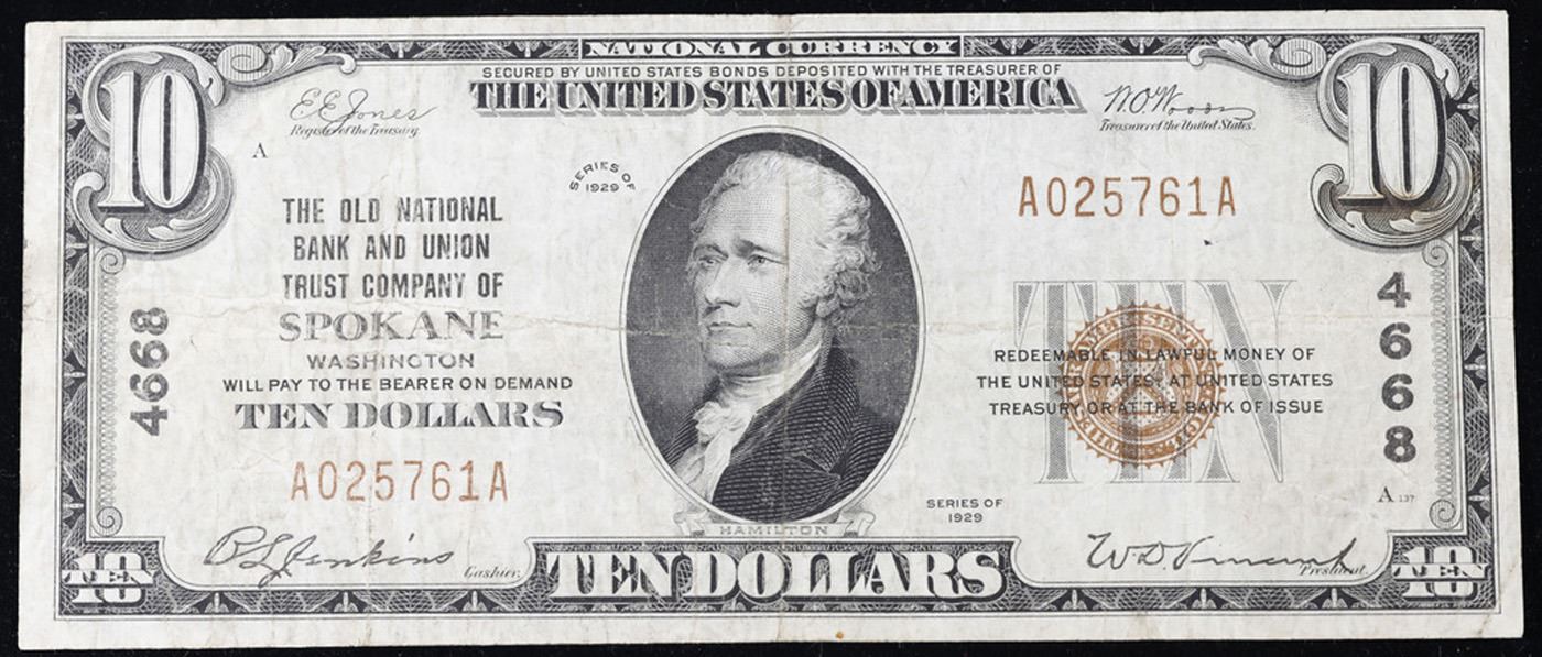 1929 $10 National Currency 'The Old National Bank & Union Trust Company Of Spokane WA' Type I Grades