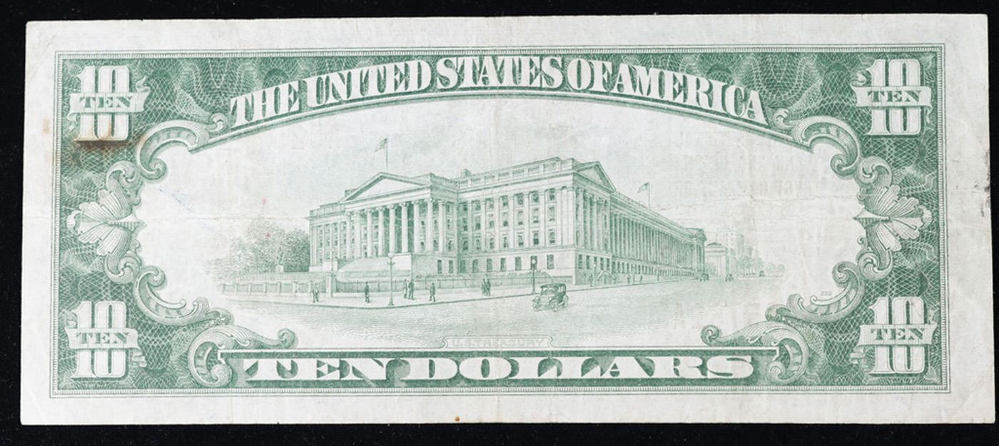 1929 $10 National Currency 'The Old National Bank & Union Trust Company Of Spokane WA' Type I Grades vf++. Backed by bonds deposited with the Federal Government, this kind of money says “National Currency” at the top center of the note. These notes were issued by banks who received a Charter from the United States government allowing them to issue money. The Government Printing Office printed these notes with the same design except for the name of the banks, signatures of the bank officers and the Charter number. National Currency notes were made from 1863 to 1929. These notes were a way of creating confidence in an always shaky banking system. Member banks were required to deposit bonds with the government. The bank could then issue currency equal to 90% of the amount of the bonds. The financial panic of 1929 destroyed many of the National Banks and put an end to this system.There were more than 14,000 banks that issued National Currency and there are large numbers of avid collectors. The 1929 issue was the only “small size” issue, that is to distinguish from the “horse blanket” size notes of years previous to 1929. The note comes in two types. The Type I note has a brown seal with the charter number only in large black numerals. Type 2 notes have in addition the charter number printed with brown letters near the serial number of the note. This is from the 'Bank of America and Saving Association San Francisco' Charter number 13044. National Currency was only made at this bank in 1929