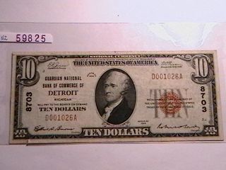 1929 $10 National Currency VF20. "Guardian National Bank of Commerce of Detroit, MI. Will Pay bearer on demand $10. brown seal with "8703" on each end.