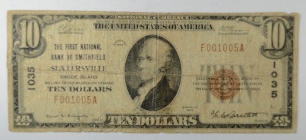 FNB SMITHFIELD SLATERSVILLE RI VG RARE NOTE est $350-$375