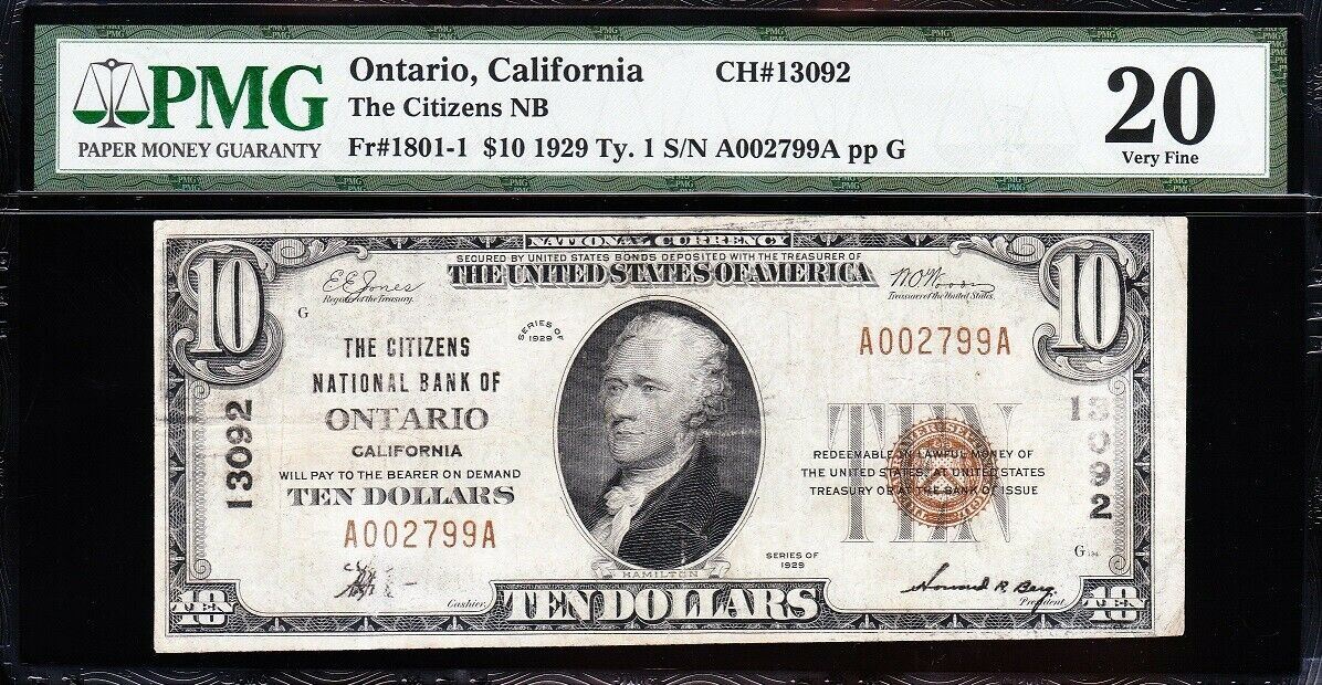 One 1929 $10 Ontario CA National Bank Note PMG 20.