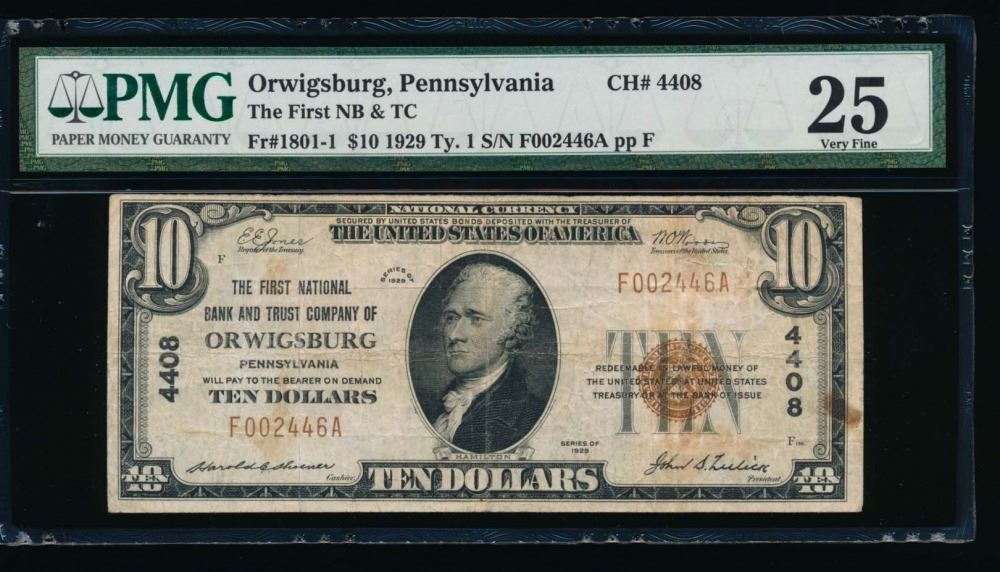 One 1929 $10 Orwigsburg National Bank Note PMG 25.