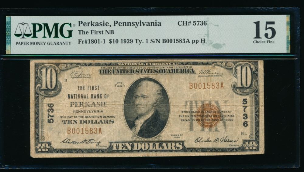 One 1929 $10 Perkasie PA National PMG 15.