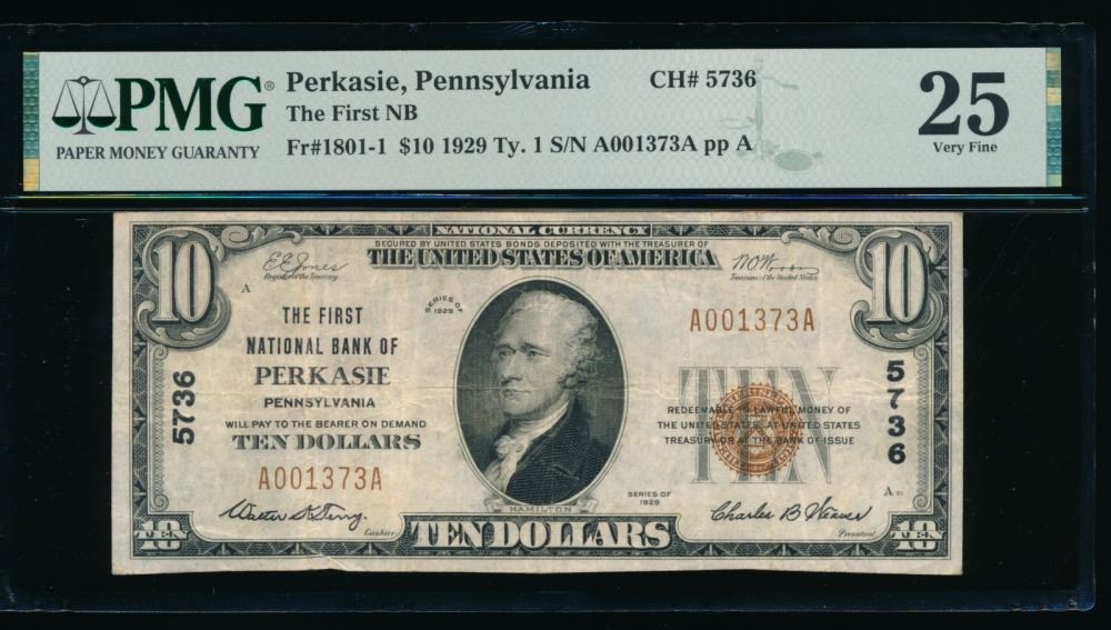 One 1929 $10 Perkasie PA National PMG 25.