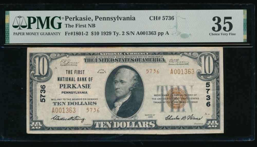 One 1929 $10 Perkasie PA National PMG 35.
