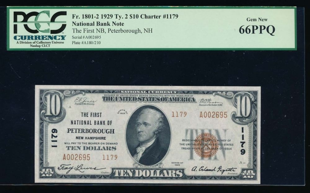 One 1929 $10 Peterborough NH National Bank Note PCGS 66PPQ.
