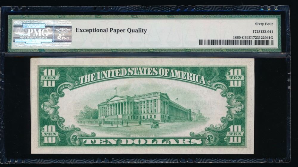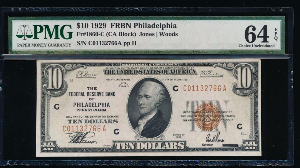 One 1929 $10 Philadelphia Federal Reserve Bank Note PMG 64EPQ.
