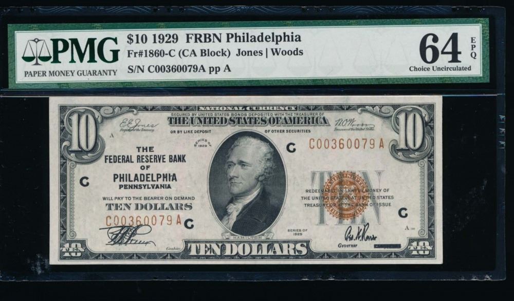 One 1929 $10 Philadelphia Federal Reserve Bank Note PMG 64EPQ.