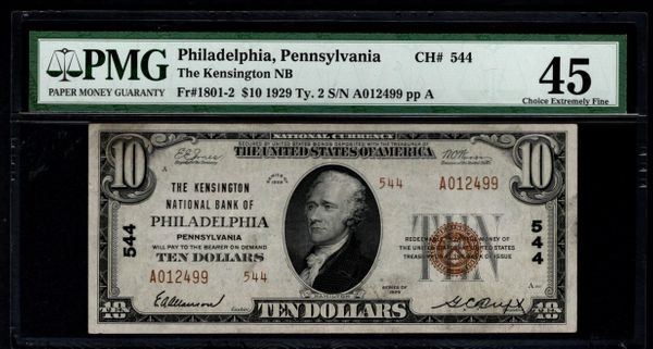 One 1929 $10 Philadelphia National Bank Note PMG 45.