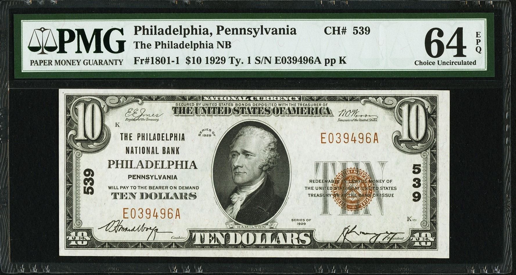 One 1929 $10 Philadelphia National Bank Note PMG 64EPQ.