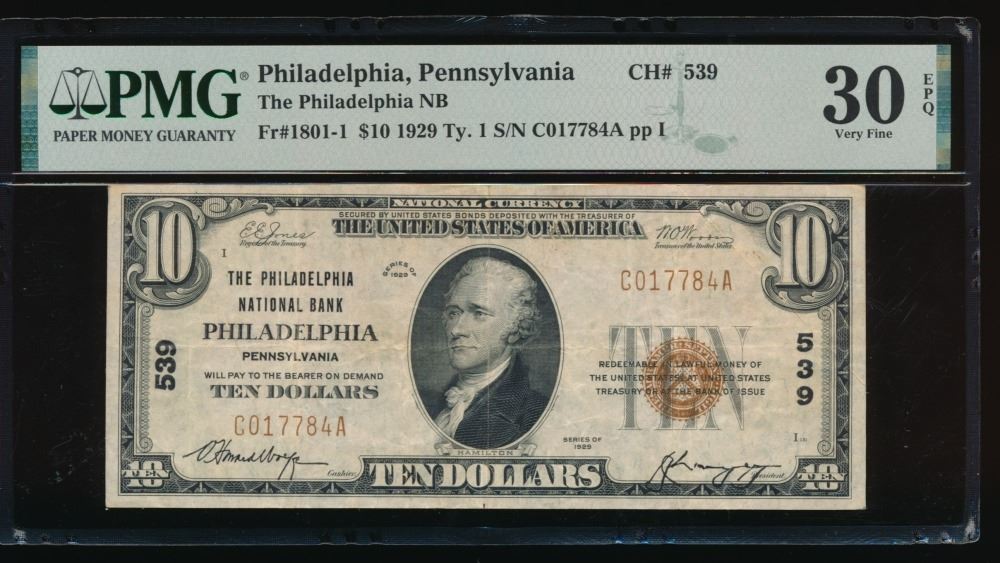 One 1929 $10 Philadelphia PA National PMG 30EPQ>