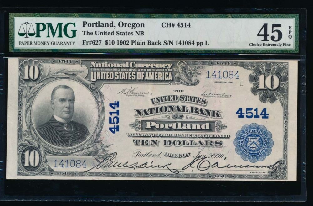 One 1929 $10 Portland National Bank Note PMG 45EPQ.