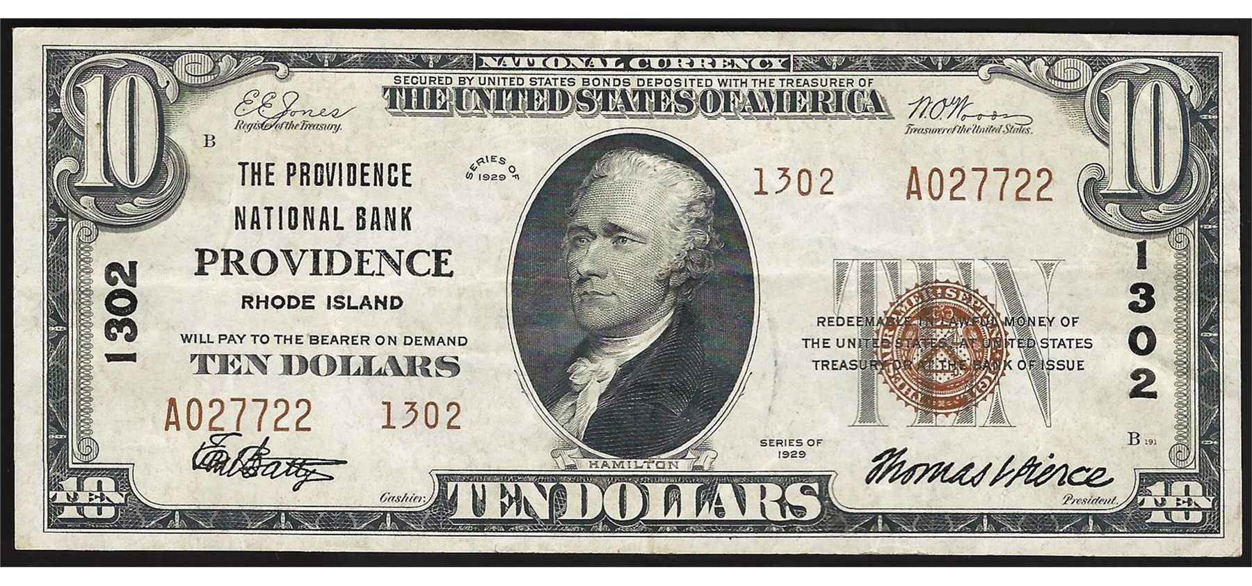 One 1929 $10 Providence National Bank of Rhode Island National Currency Note CH# 1302.