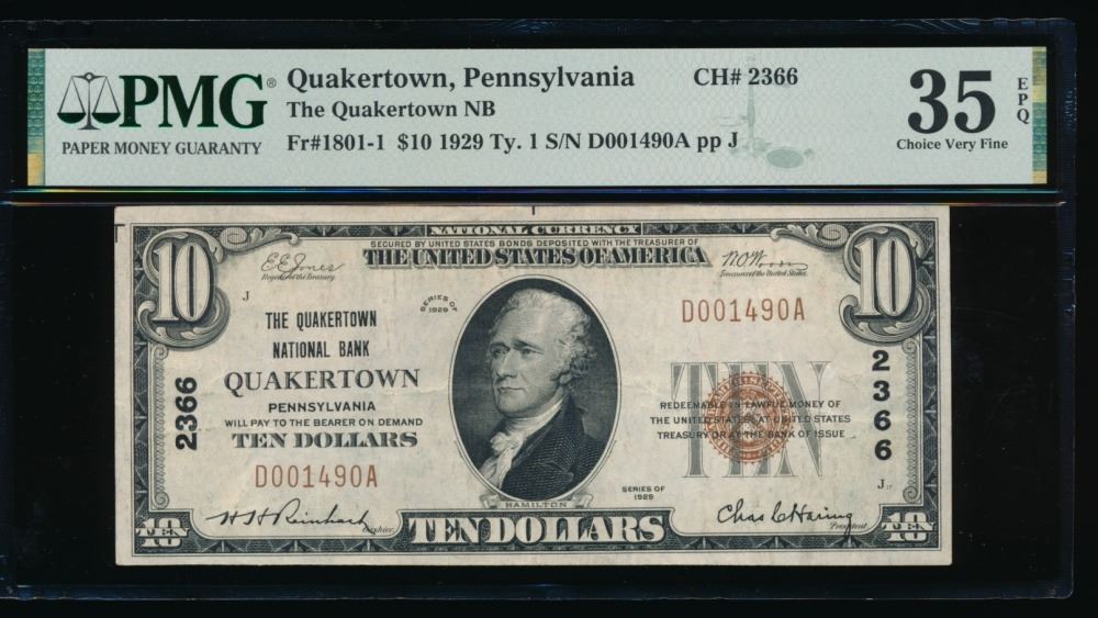 One 1929 $10 Quakertown PA National PMG 35EPQ.