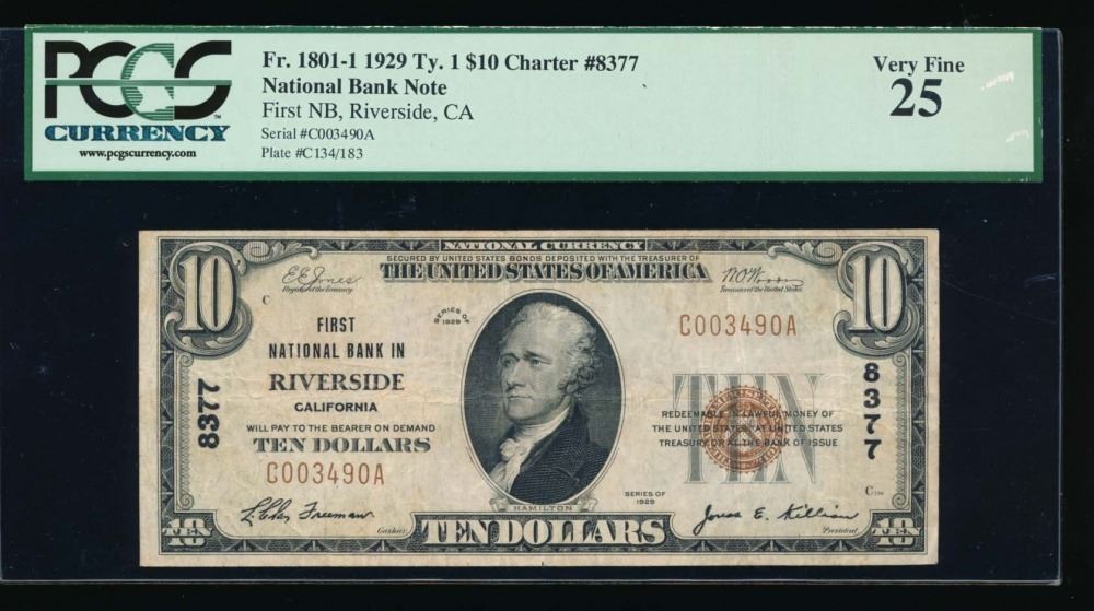 One 1929 $10 Riverside National Bank Note PCGS 25PPQ.