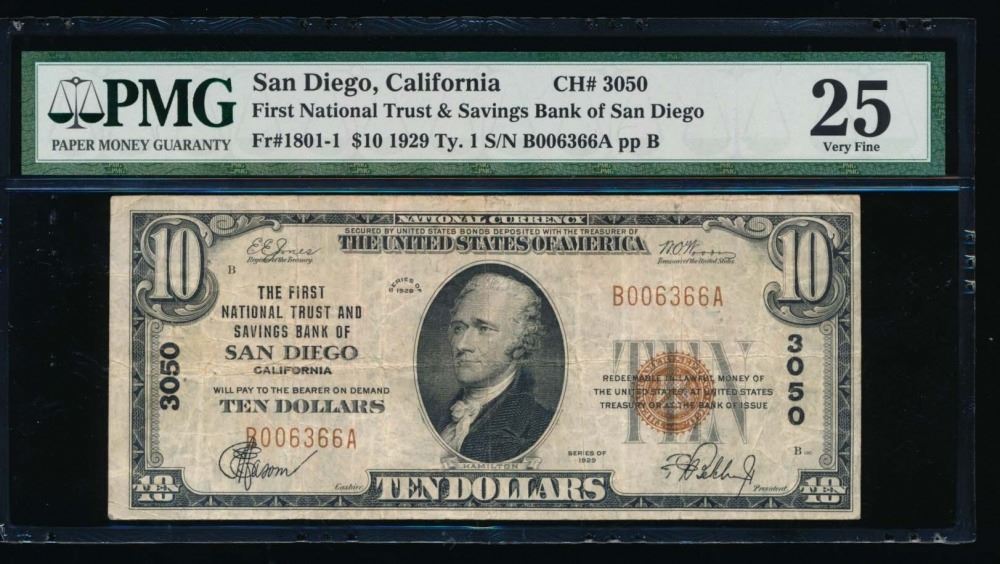 One 1929 $10 San Diego National Bank Note PMG 25.
