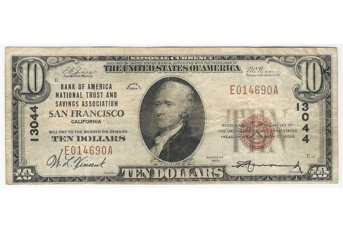 One 1929 $10 San Francisco California National Currency Note.