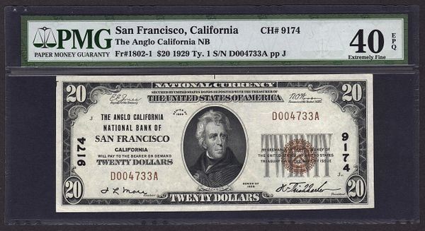 One 1929 $10 San Francisco National Bank Note PMG 40EPQ.