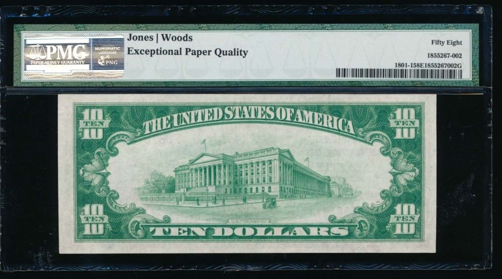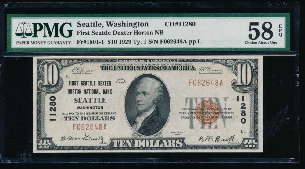 One 1929 $10 Seattle National Bank Note PMG 58EPQ.