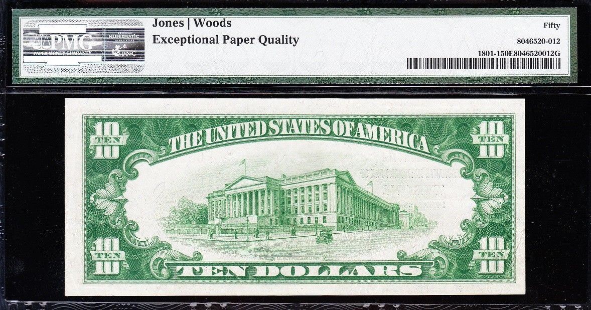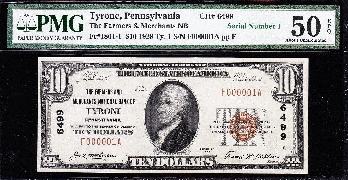 One 1929 $10 Serial No 1 Tyrone National Currency Note PMG 50EPQ.