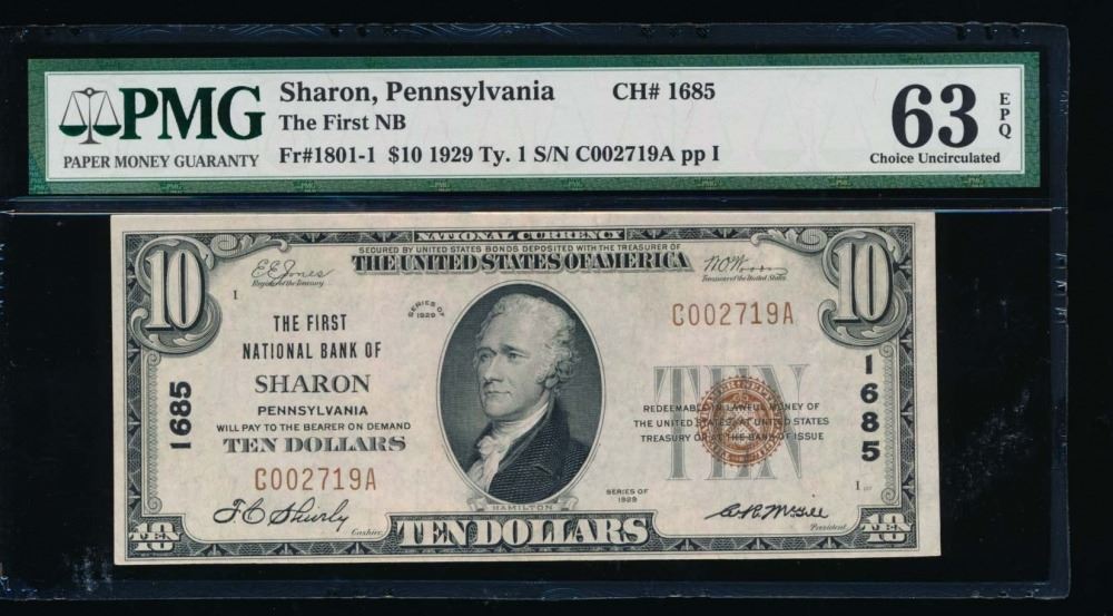 One 1929 $10 Sharon National Bank Note PMG 63EPQ.