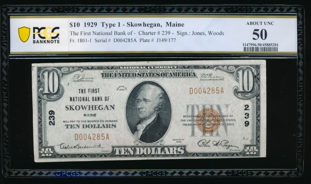 One 1929 $10 Skowhegan ME National PCGS 50.