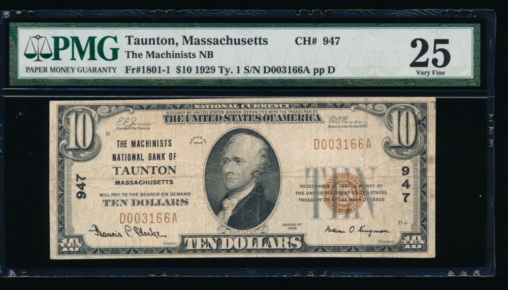 One 1929 $10 Taunton National Bank Note PMG 25.