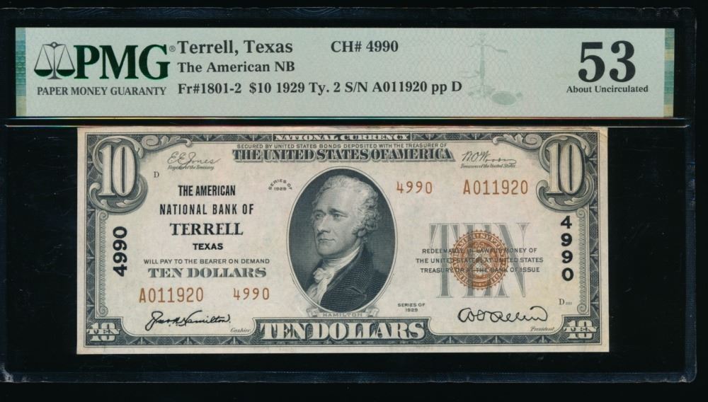 One 1929 $10 Terrell TX National PMG 53.