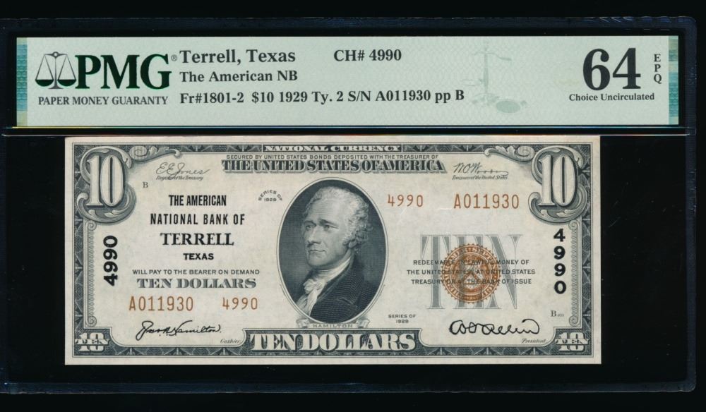 One 1929 $10 Terrell TX National PMG 64EPQ.