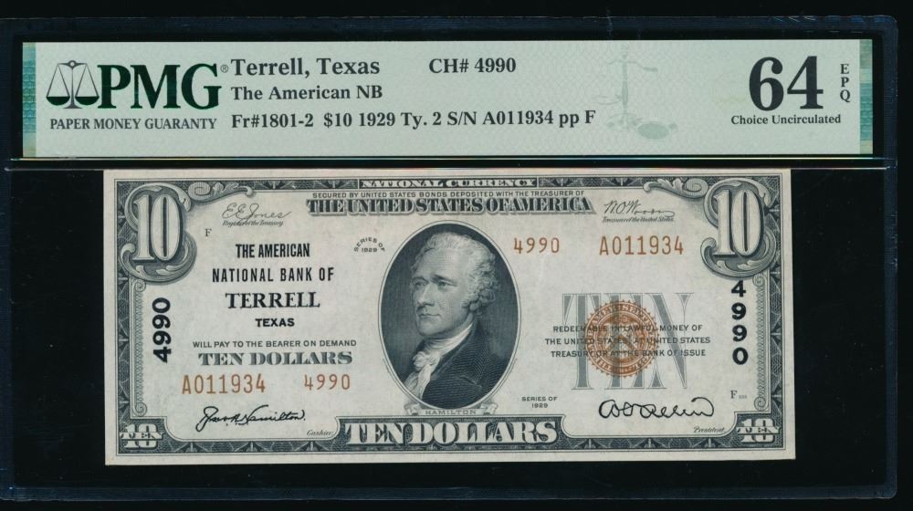 One 1929 $10 Terrell TX National PMG 64EPQ.