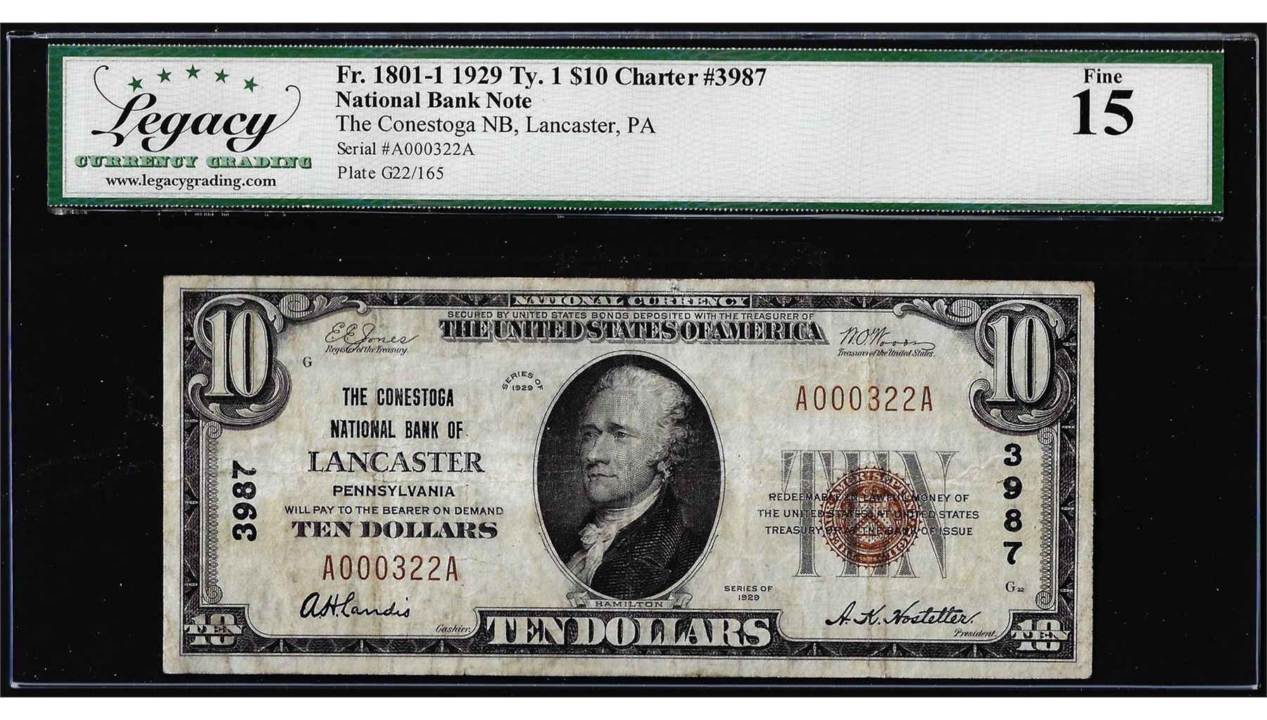 1929 $10 The Conestoga NB Lancaster, PA CH# 3987 National Currency Note Legacy Fine 15