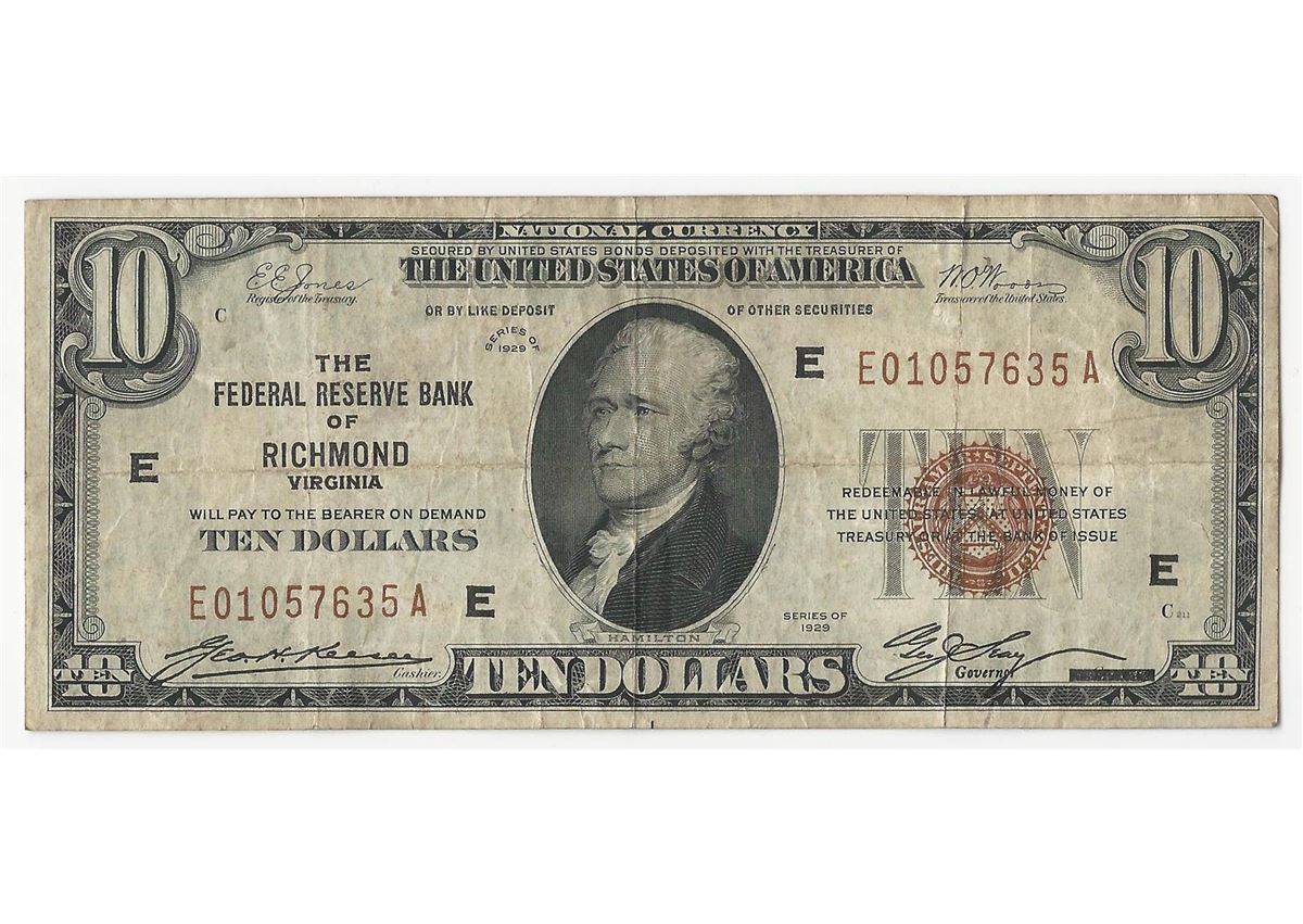One 1929 $10 The Federal Reserve Bank of Richmond National Currency Note.