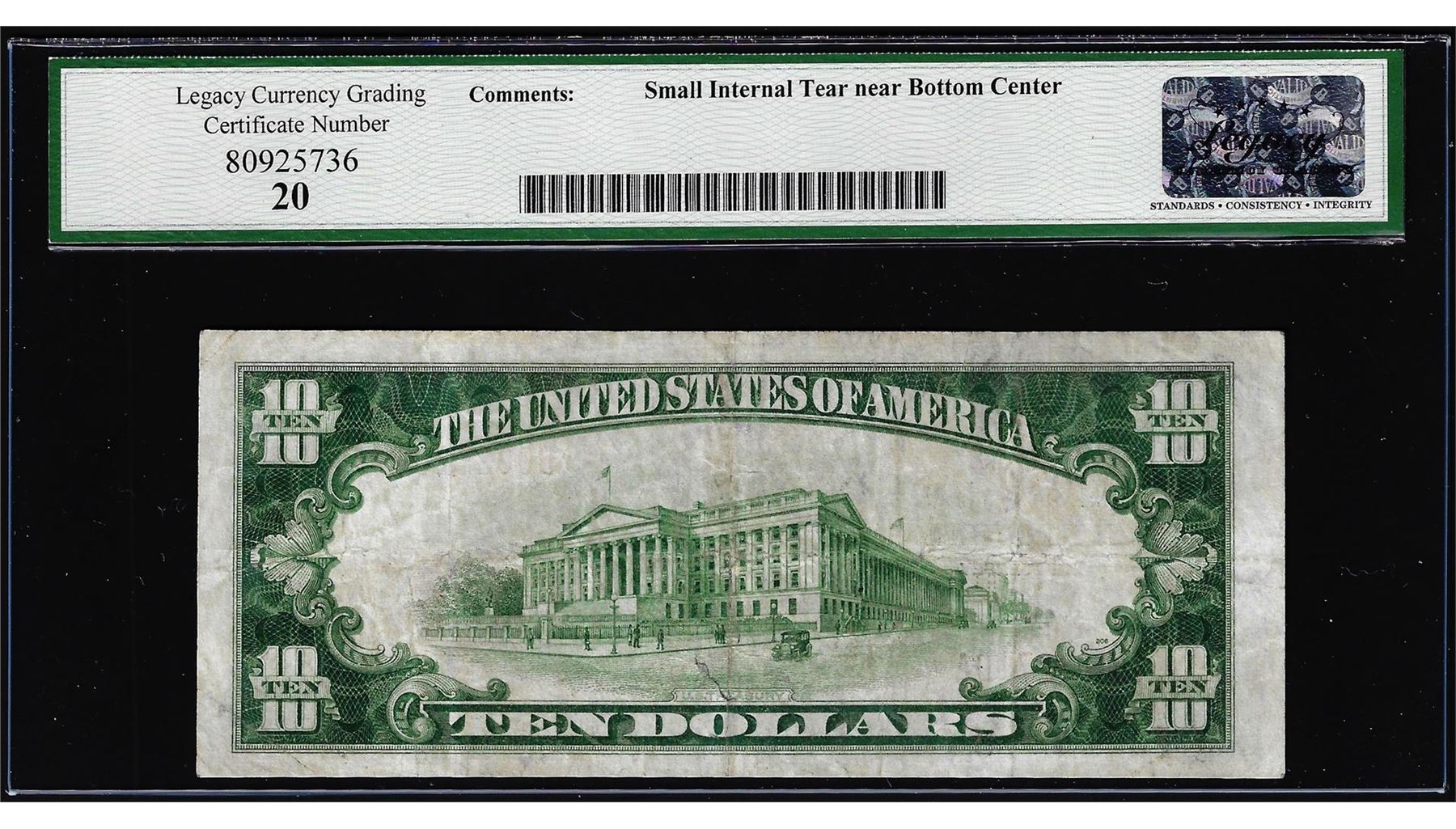 One 1929 $10 The First NB Belleville, NJ CH# 8382 National Currency Note Legacy VF20. Legacy Graded.