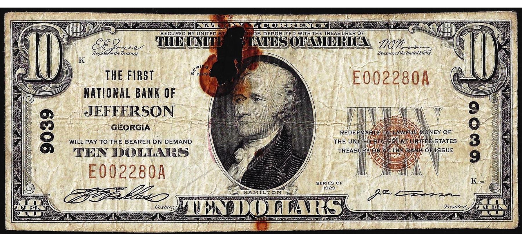 1929 $10 The First NB of Jefferson, GA CH# 9039 National Currency Note