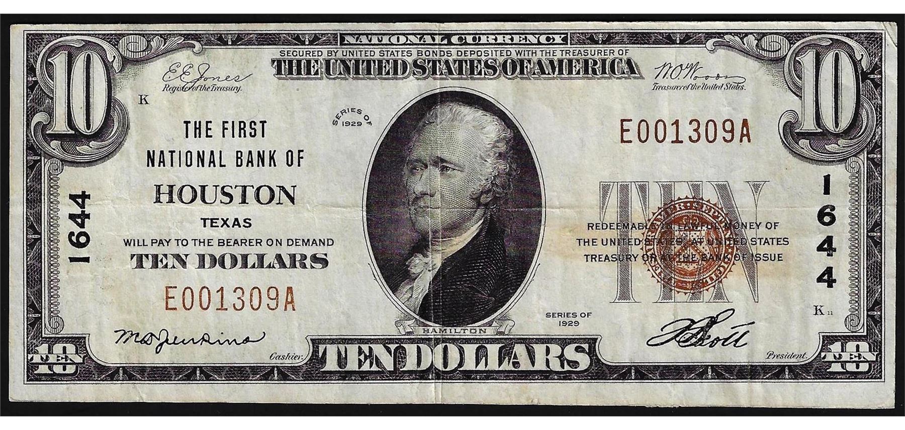 One 1929 $10 The First National Bank of Houston TX National Currency Note CH# 1644.
