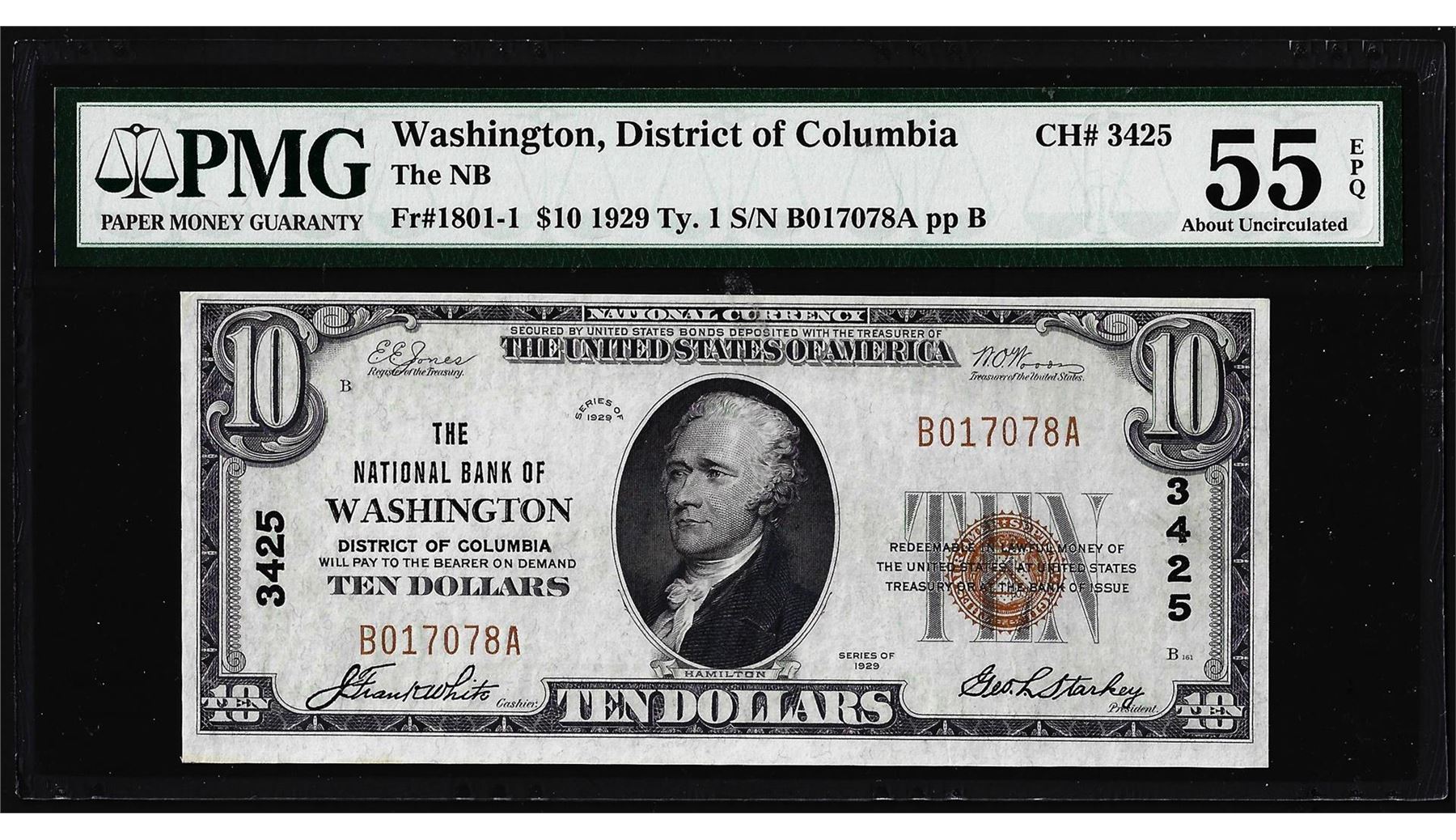 1929 $10 The NB Washington, D.C. CH# 3425 National Note PMG About Uncirculated 55EPQ