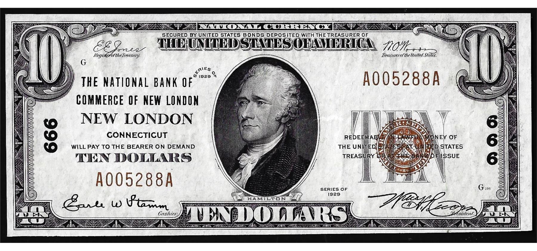 One 1929 $10 The National Bank of Commerce New London, CT CH# 666 National Currency Note.