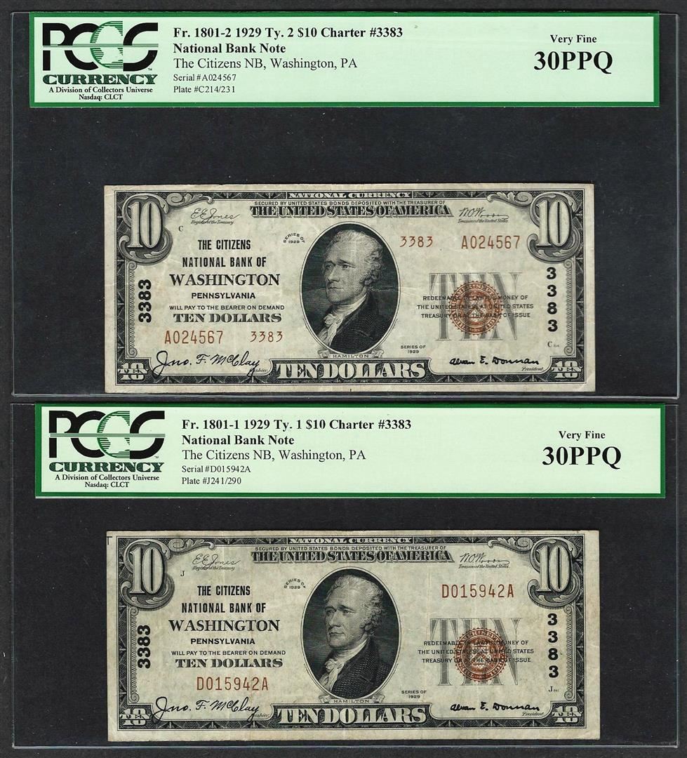 One 1929 $10 Ty.1/2 Citizens NB Washington, PA CH# 3383 National Currency Notes PCGS VF30PPQ. PCGS Graded.