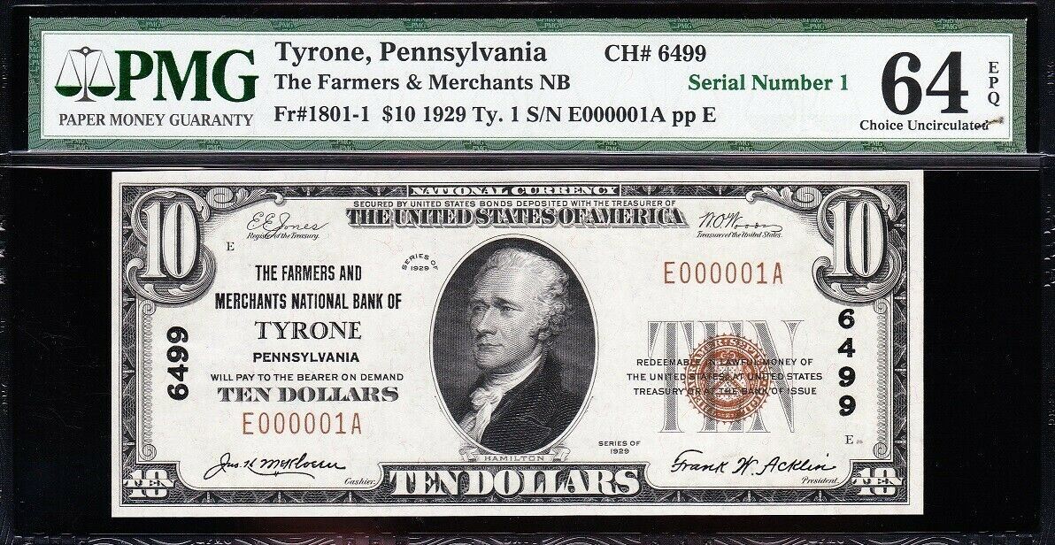 One 1929 $10 Tyrone PA National Bank Note PMG 64EPQ.