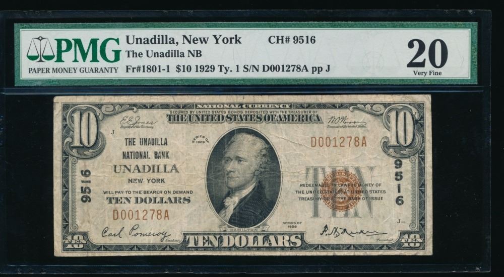 One 1929 $10 Unadilla NY National PMG 20.