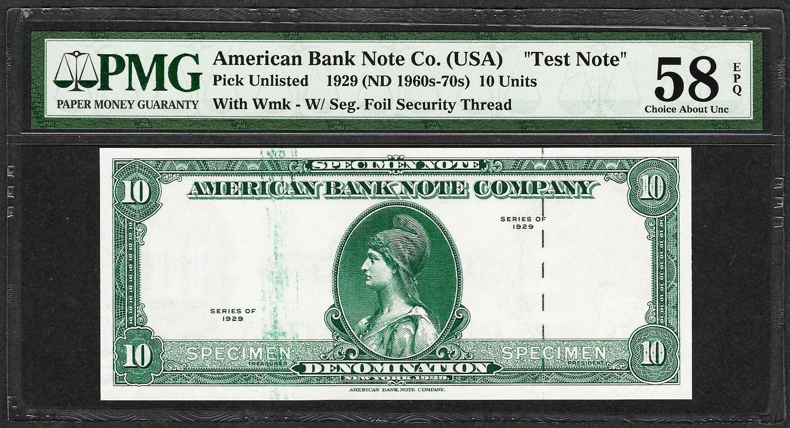 1929 10 Unit American Bank Note Co. "Test Note" PMG Choice About Unc. 58EPQ