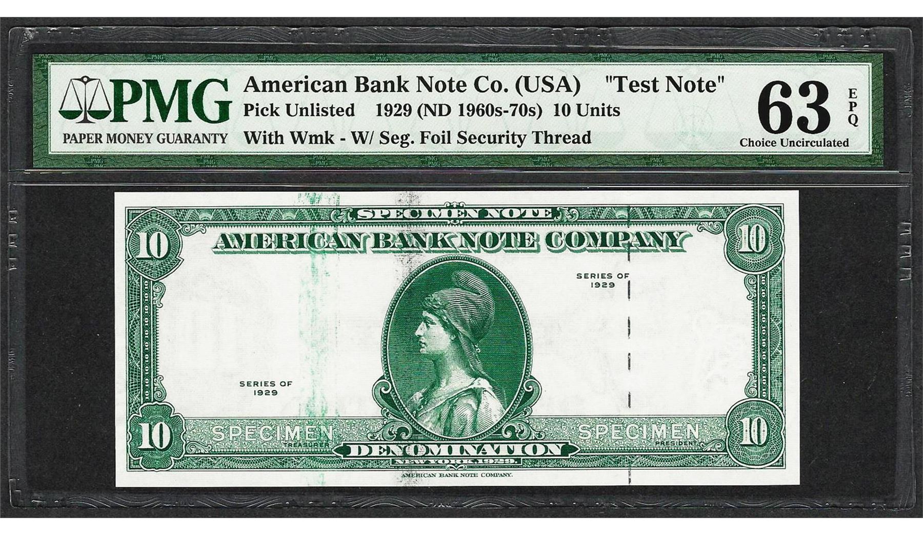One 1929 10 Unit American Bank Note Co. "Test Note" PMG Choice Uncirculated 63EPQ. PMG Certified.