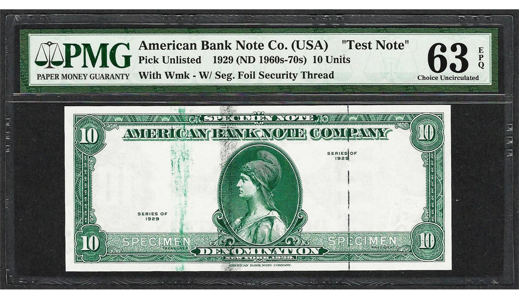 One 1929 10 Unit American Bank Note Co. "Test Note" PMG Choice Uncirculated 63EPQ. PMG Certified.