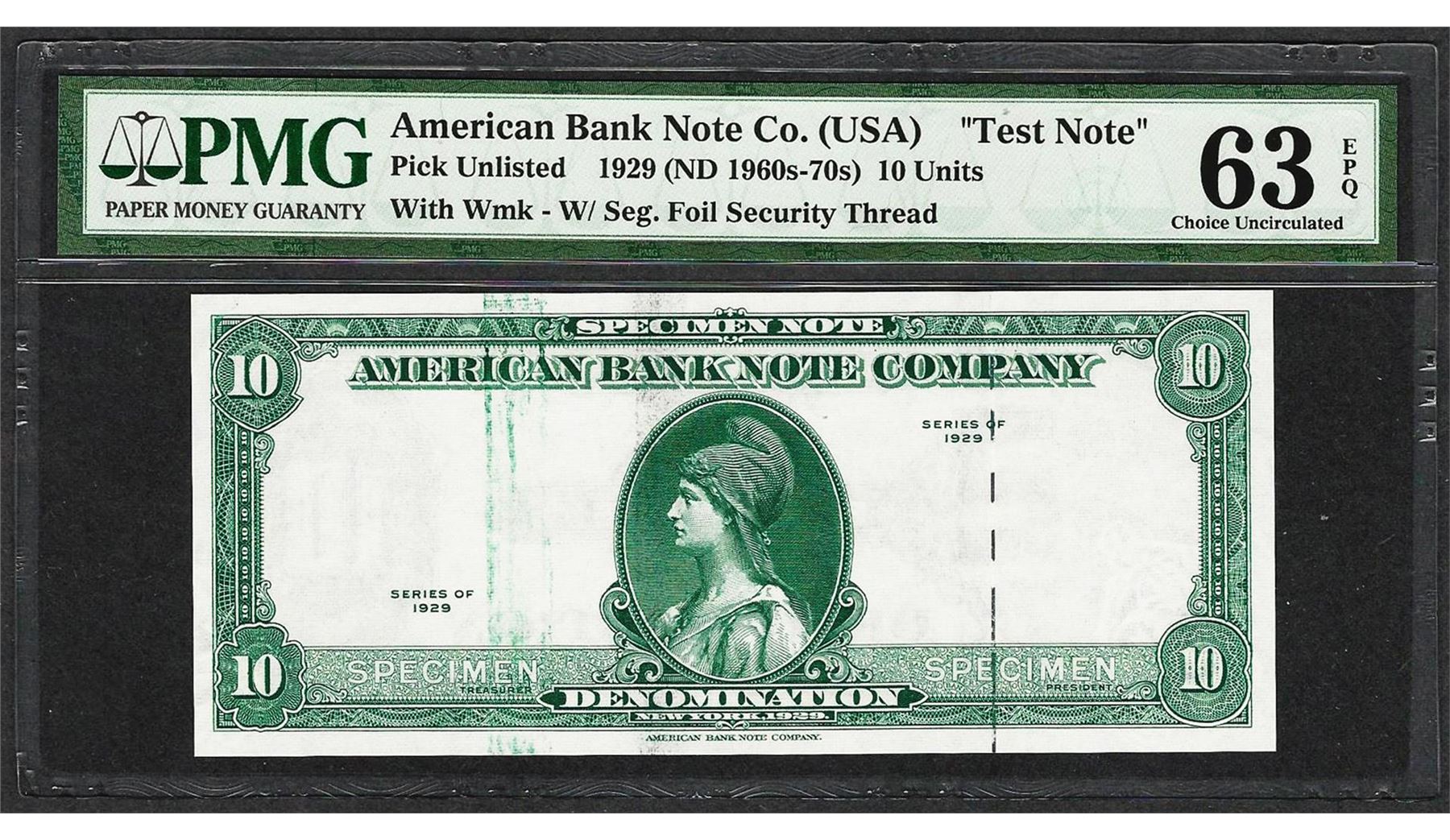 One 1929 10 Unit American Bank Note Co. "Test Note" PMG Choice Uncirculated 63EPQ. PMG Certified.
