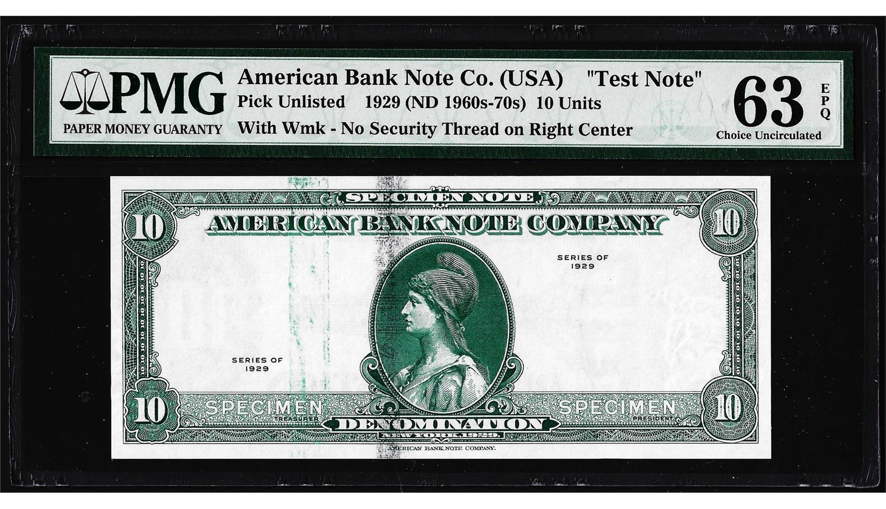 1929 10 Unit American Bank Note Co. "Test Note" PMG Choice Uncirculated 63EPQ