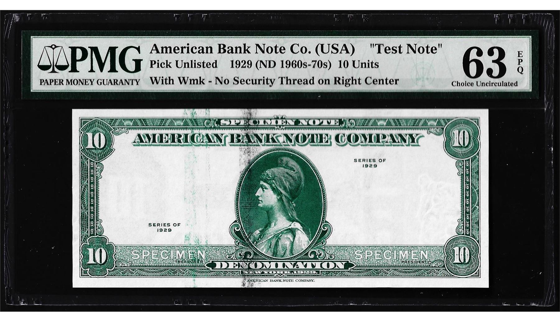 One 1929 10 Unit American Bank Note Co. "Test Note" PMG Choice Uncirculated 63EPQ. PMG Certified.