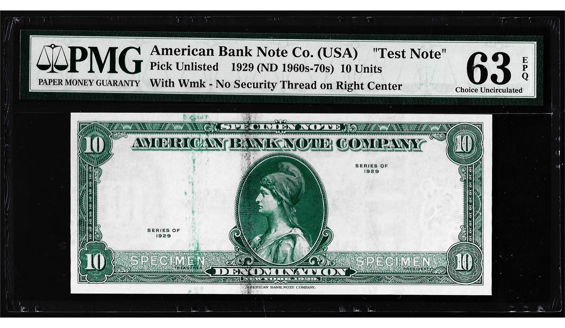 One 1929 10 Unit American Bank Note Co. "Test Note" PMG Choice Uncirculated 63EPQ. PMG Certified.